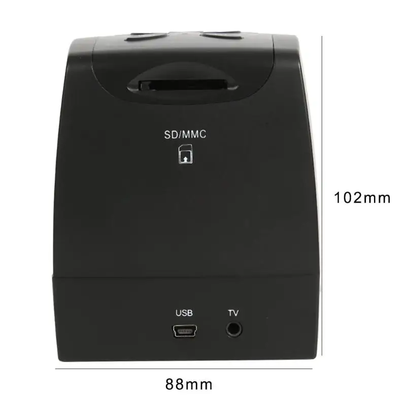 Feature: 1. Simple, Fashionable Appearance Design. 2. Embedded SD/MMC memory card slot. 3. The screen is 2.36 inches wide. The color LCD screen can display photos directly. 4. Powerful Processors for Automatic Exposure/Color Balance Algorithms. 5. Supporting image preview, playback and editing functions. 6. USB port power adapter. 7.1/3.2; 5MP CMOS 3:2 image ratio. 8. Support Memory card (maximum support 32GB), 1G storage 1200 photos. 9.USB2.0 Interface and Standard 5V USB Power Supply. 10. Real-time color preview of actual scene. 11. Automatic slide projection and screen editing 12. Support NTSC/PAL TV output interface (3.5mm video jack). 13. Support 35mm color positive, negative, color and black-and-white slides. Specification: Function: Film Scan / USB MSDC Interface: USB2.0 Image sensor: 5.0 MEGA pixels (2592 * 1944) Display: Color 2.4 "TFT lCD (480 * 234) Focus Range: Fixed Focus Exposure control: automatic/manual (-2.0EV-+2.0EV) White Balance: Automatic Resolution: 5.0MP/ 10MP(interpolation) Scanning quality: 1800Dpi and 3600Dpi (interpolation) Film type: 35mm film, Monchrome, slide Photo Effets: B&W, slide, negative Light Source: LED Backlight File format: picture: JPEG TV output type: NTSC/PAL External Storage Card: Memory Card up to 32GB Power supply: DC 5V (ADAPER USB port) Multilingual support Product size: 102*88*86 mm/4.01*3.46*3.38'' Packing weight: 570g Sensors: 1/3.2 "5mega CMOS Effective resolution: 5mega Storage media: internal: built-in 32MB flash card External: memory card, compatible with SDHC card Sensitivity: Automobile Lens: Fixed focal length F/6.0, F=6.34 mm Focus range: 5.6cm Still image: format: JPEG, resolution: 5M, 10M (interpolation) Zoom: no Display screen: 2.36"TFT TV output format: NTSC/PAL Light Source: Backlight Compensation White Balance: Automatic Exposure compensation: automatic Interface: MSDC: USB2.0 (High Speed) Auto Open: No Power supply: DC 5V Operating System: Windows XP, Vista, 7 CPU: Intel Pentium 42.8 GHz or more Memory: 512MB or more Video card: 64MB or high-top video card Transfer Connection: Standard USB 2.0 or above Hard disk capacity: at least 200 MB Plug type: EU, US Note: Please allow 1-3mm differs due to manual measurement. Due to the different display and different light, the picture may not show the actual color of the item. Thanks for your understanding. 1 X Slide Film Scanner 1 X USB Cable 1 X Charger 1 X Video Cable 2 X Negative Tray 1 X Brush 1 X User Manual