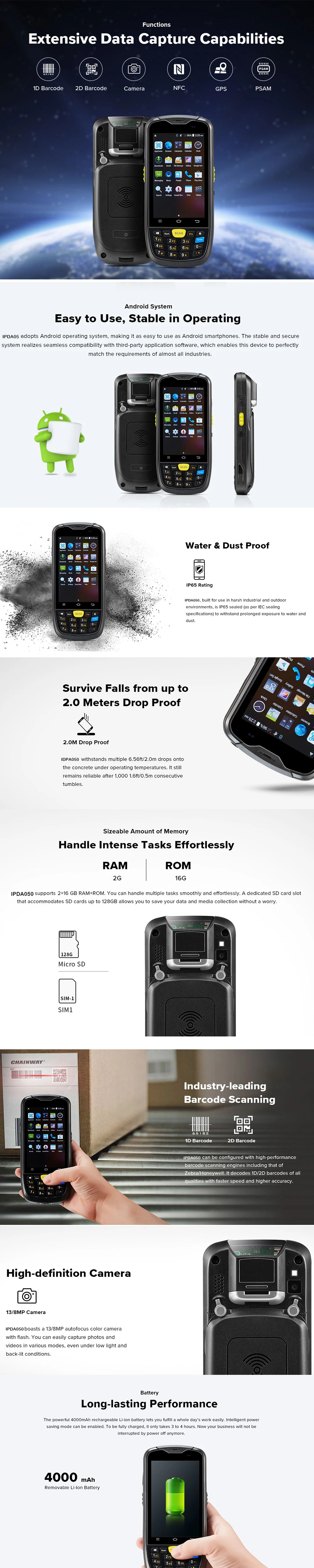 Functions: 1.Industry-leading Scan Head, 2.NFC, 3.8/13MP Camera, 4.Accurate GPS, Secure PSAM
