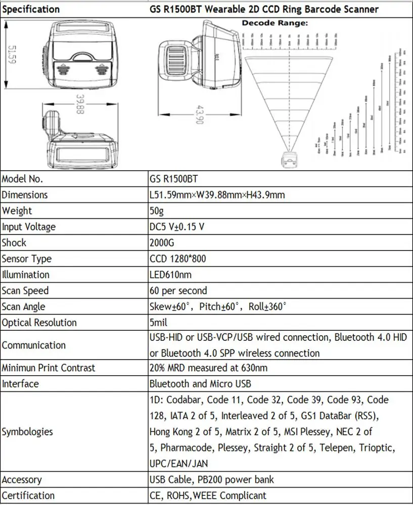 GS R1500BT-HW 2D CCD wearable ring barcode scanner is a new generation of mini scanner allowing you for mobile scanning, picking and sorting application.It is small size and easy to carry.With BT 4.0 (BLE) function, GS R1500BT-HW scanner supports Bluetooth HID,SPP(Master/Slave) and BLE connecting.It is very easy to connect with IOS, Android, Windows, Windows OS,ect.
